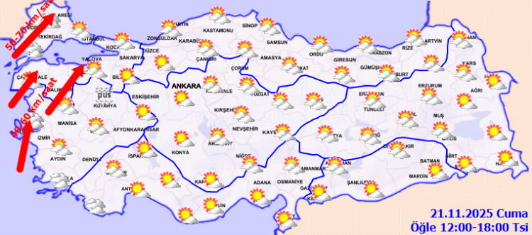 Rüzgarın; Marmara’nın batısı ile Kuzey Ege kıyılarında güney ve güneybatı yönlerden kuvvetli (40-60 km/saat), Trakya’da yer yer kısa süreli fırtına (50-70 km/ saat) şeklinde esmesi bekleniyor. Sabah ve gece saatlerinde Doğu Anadolu ile Güneydoğu Anadolu’nun kuzeyinde pus ve yer yer sis bekleniyor.
