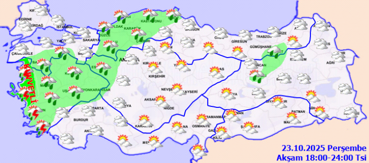 Marmara, Ege, Batı Akdeniz, Doğu Akdeniz’in Toroslar kesimi, Batı ve Orta Karadeniz, Doğu Karadeniz’in iç kesimleri, Doğu Anadolu’nun kuzey ve batısı ile Eskişehir, Ankara, Çankırı, Sivas, Çorum, Bitlis ve Van çevrelerinde yağmur ve sağanak yağış bekleniyor.