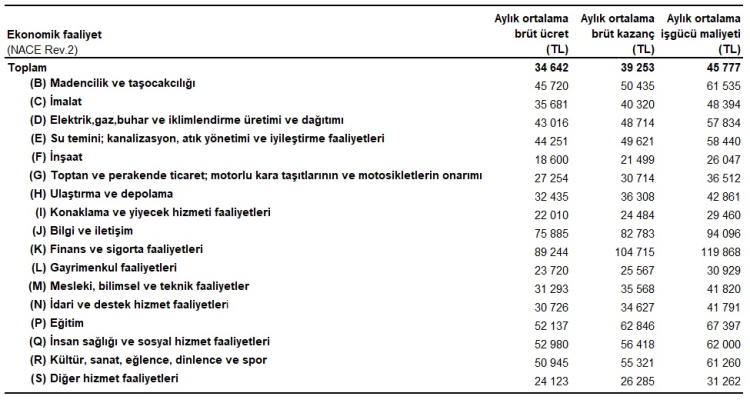 Sektörel dağılıma bakıldığında, finans ve sigorta faaliyetleri aylık 119 bin 868 TL ile işgücü maliyetinin en yüksek olduğu sektör oldu.