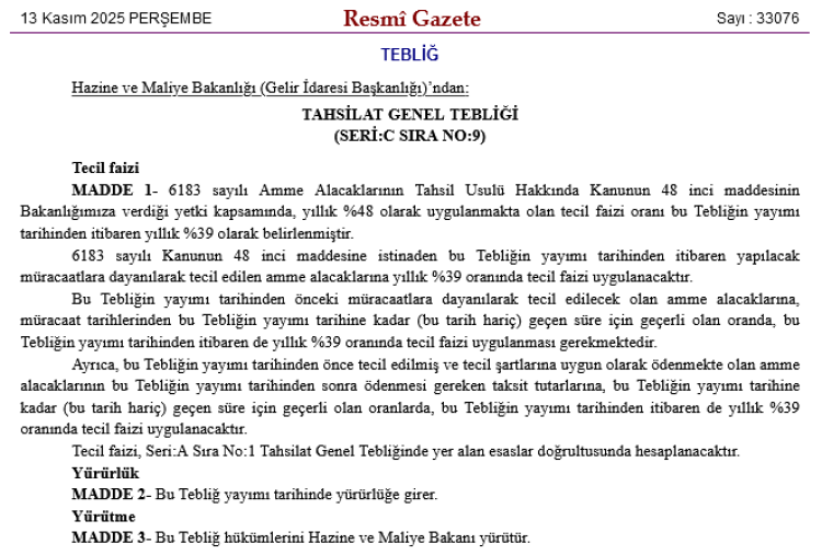 Aynı sayıda yayımlanan Tahsilat Genel Tebliği (Seri: C, Sıra No: 9) ile de, söz konusu kanunun 48’inci maddesi kapsamında uygulanan tecil faizi oranı yıllık yüzde 48’den yüzde 39’a düşürüldü.