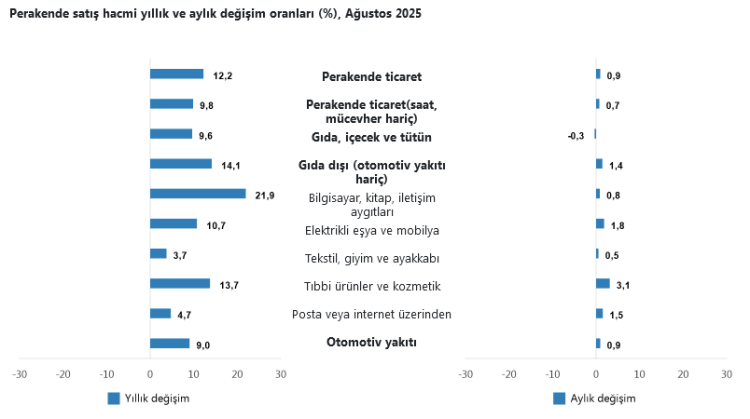 TÜİK'in verilerine göre ticaret sektörü 2025 yılı Ağustos ayında büyümesini sürdürdü. Yıllık bazda motorlu kara taşıtlarının ve motosikletlerin toptan ve perakende ticareti ile onarımı yüzde 12,8’lik artışla en yüksek büyümeyi kaydederken, perakende ticaret yüzde 12,2, toptan ticaret ise yüzde 3,4 artış gösterdi.