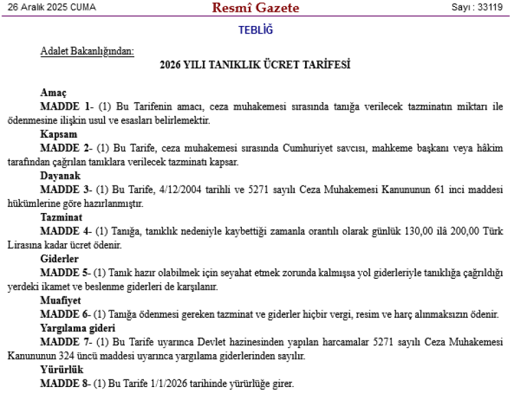 1 Ocak 2026 tarihi itibariyle tanığa, tanıklık nedeniyle kaybettiği zamanla orantılı olarak günlük 130 ile 200 TL'ye kadar ücret ödenmesi kararlaştırıldı. Tanığa ödemesi gereken tazminat ve giderlerde hiçbir vergi, resim ve harç alınmaksızın ödeneceği hüküm altına alındı.