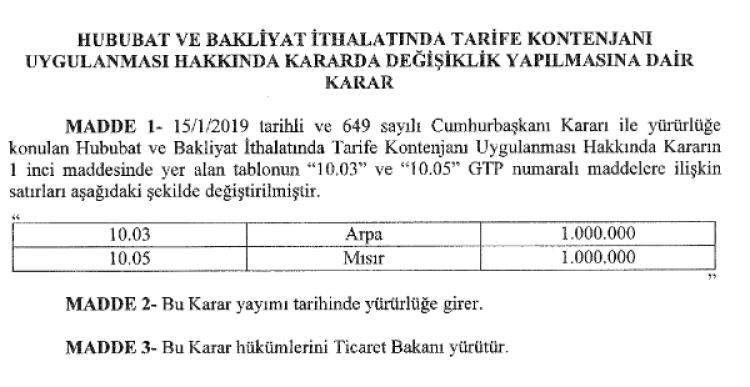 Buna göre, arpa ve mısır ithalatında tarife kontenjanları 700 bin tondan 1 milyon tona yükseltildi.