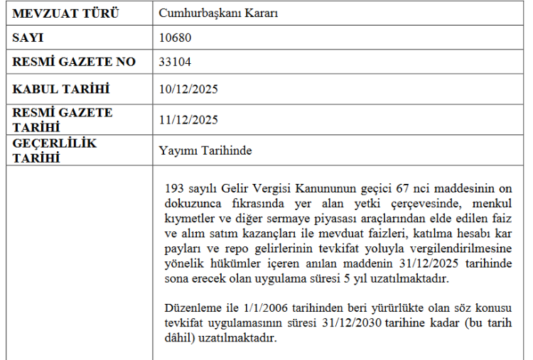 Bugünkü Resmi Gazete'de yayımlanan Cumhurbaşkanı Kararı ile Gelir Vergisi mevzuatında önemli bir uzatma getirdi.