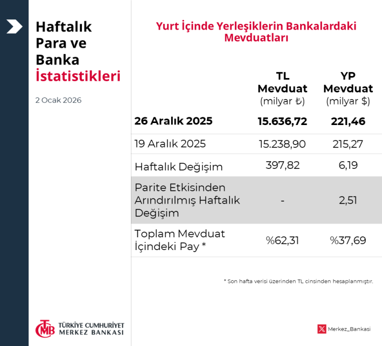 Bankacılık sektörü mevduat, kredi, menkul kıymet ve para arzı gelişmelerinin haftalık bazda özetlendiği bültende yayımlanan verilere göre, özellikle yabancı para mevduatlarında haftalık değişim ve parite etkisi tabloları dikkat çekti.