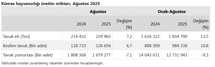Tavuk Eti Üretimi yüzde 13,5 artışla toplam 229 bin 965 ton olurken, kesilen tavuk sayısı yüzde 10,8 arttı. Tavuk yumurtası üretimi ise yüzde 9,3 azalma ile 1,68 milyar adet oldu.