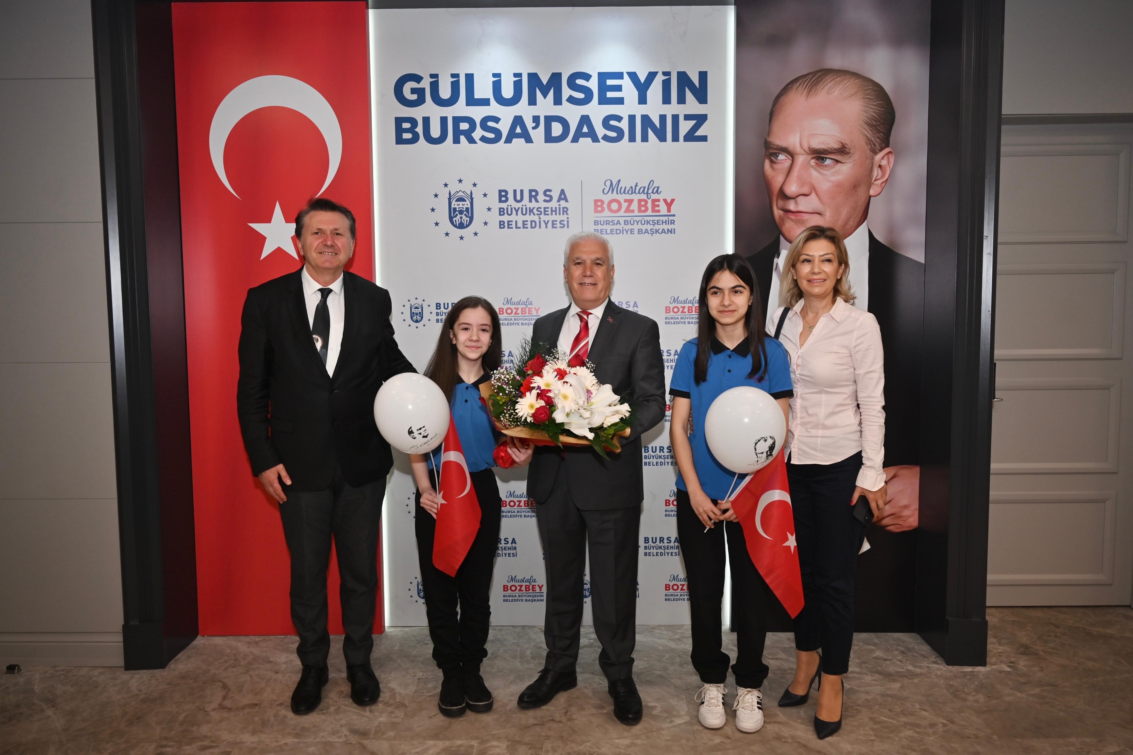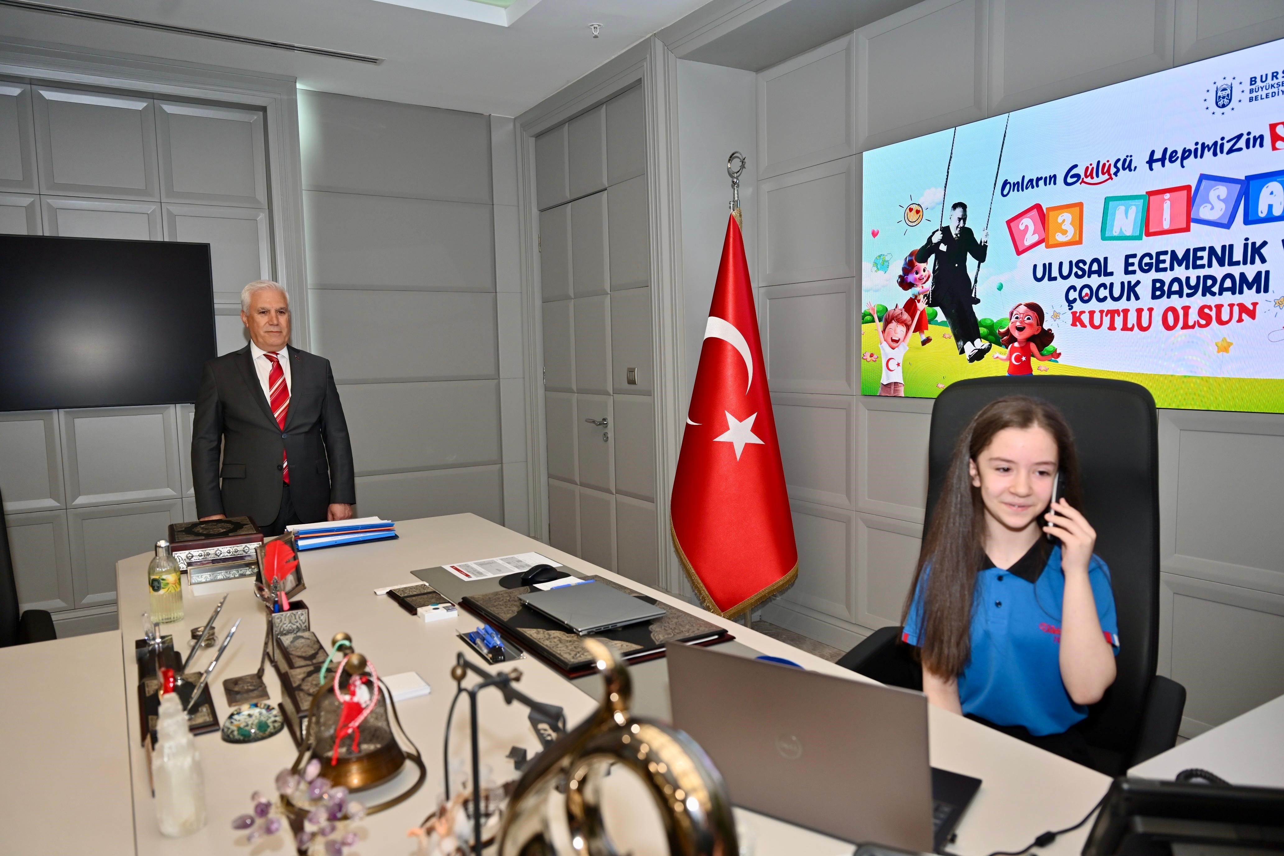 23 Nisan Ulusal Egemenlik ve Çocuk Bayramı’nda, geleceğin ülke ve kent yöneticileri başkanlık koltuklarını devraldı. Bursa Büyükşehir Belediye Başkanı Mustafa Bozbey de koltuğunu Dilek Özer Ortaokulu 7. sınıf öğrencileri Duru Tuna ve İlke Ormancı’ya devretti. Bursa Büyükşehir Belediyesi Hizmet Binası’nda düzenlenen devir teslim töreninde, geleceğin başkanlarına Büyükşehir Belediyesi Genel Sekreter Yardımcısı Mehmet Yıldız, okul müdürü Tayfun Şahin, sınıf öğretmenleri ve aileleri de eşlik etti.