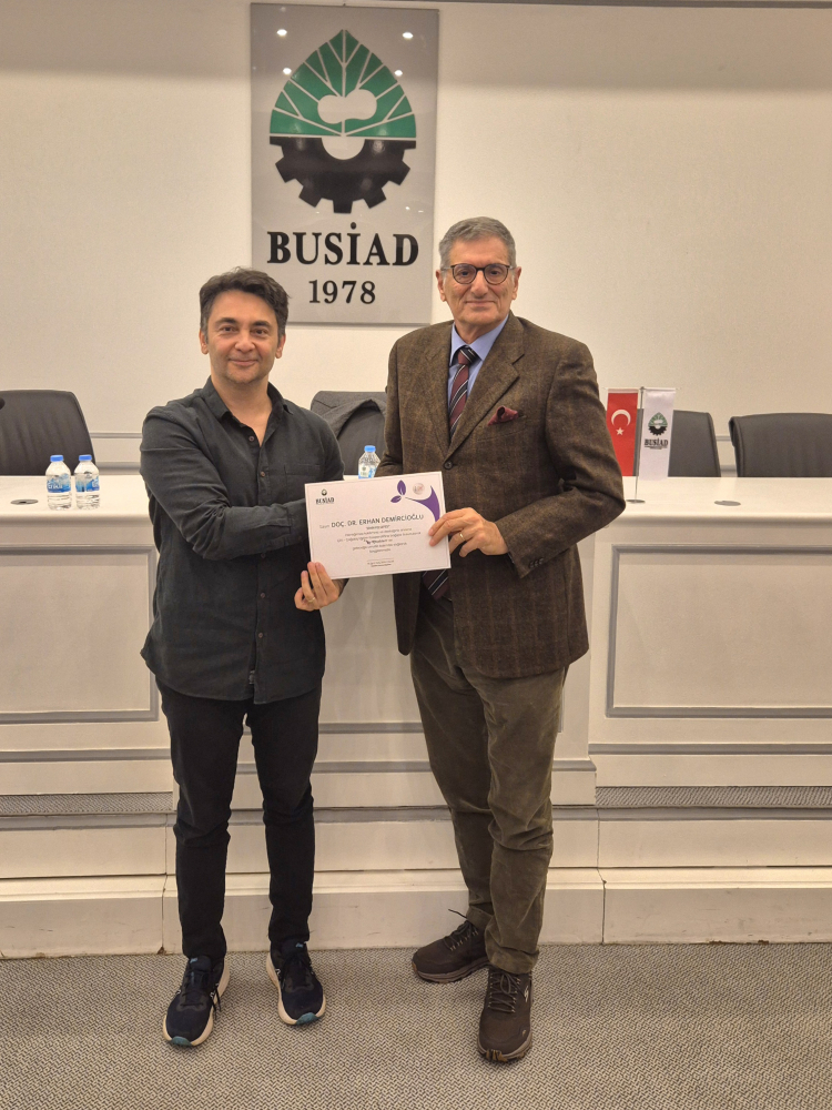 Söyleşi sonrası soruları da yanıtlayan Doç. Dr. Demircioğlu ve Prof. Dr. Becermen’e Çağdaş Eğitim Kooperatifi'nin “Kır Çiçekleri Okusun Diye” sosyal sorumluluk projesine adına yapılan bağışın sertifikası, geçmiş dönem BUSİAD Yönetim Kurulu Başkanlarından Mehmet Arif Özer tarafından verildi.