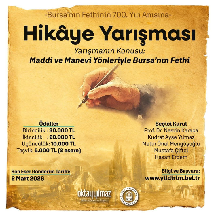 Hikâye yarışmasında birinciye 30 bin TL, ikinciye 20 bin TL ve üçüncüye 10 bin TL ödül verilecek. Minyatür yarışmasında ise birinci 80 bin TL, ikinci 60 bin TL ve üçüncü 40 bin TL ile ödüllendirilecek. Yarışmanın ödül töreni ise Bursa’nın fethinin 700. yıl dönümü olan 6 Nisan 2026 tarihinde düzenlenecek.