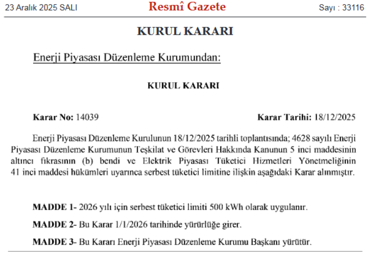 Bir diğer karar olan 14039 sayılı karar ise, Elektrik Piyasası Tüketici Hizmetleri Yönetmeliği hükümleri doğrultusunda, 2026 yılı serbest tüketici limiti aylık 500 kWh olarak tespit edildi. Bu değişiklik, daha fazla tüketicinin tedarikçisini serbestçe seçebilmesine olanak tanıyarak rekabeti artıracak ve potansiyel olarak faturalarda indirim fırsatı oluşturacak.