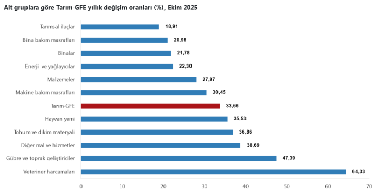 Türkiye İstatistik Kurumu (TÜİK), 2025 yılı Ekim ayına ilişkin Tarımsal Girdi Fiyat Endeksi (Tarım-GFE) verilerini açıkladı. Buna göre Tarım-GFE, bir önceki aya göre yüzde 2,04, geçen yılın aynı ayına göre yüzde 33,66 arttı.