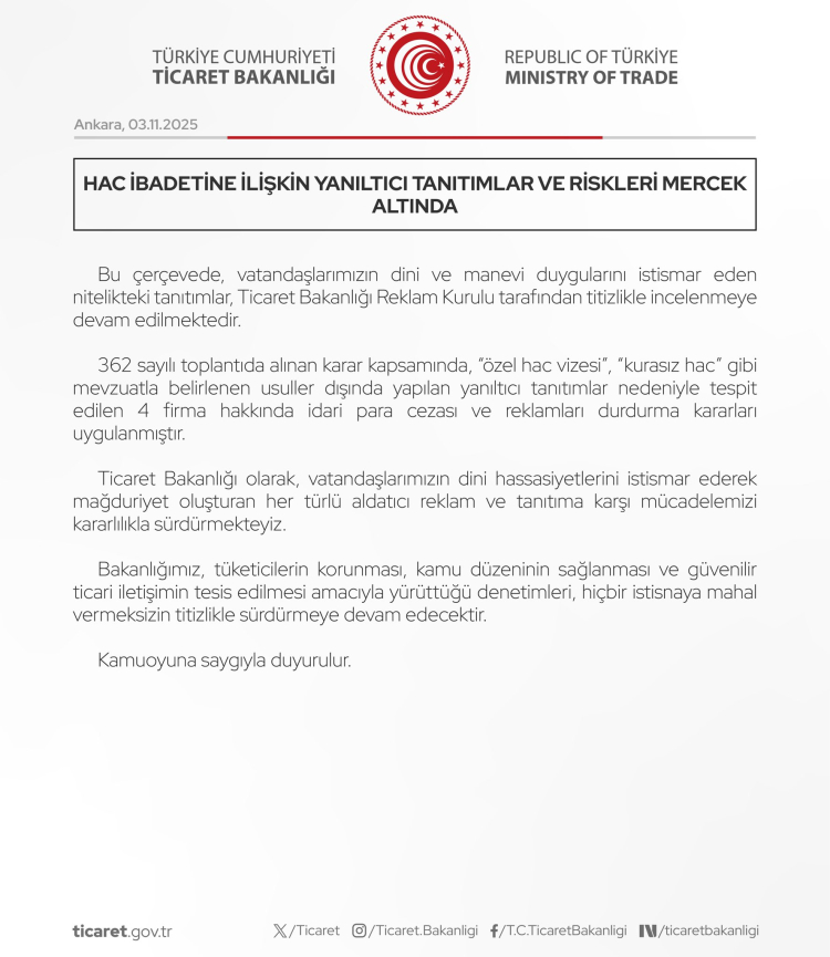 Kurulun değerlendirmesi sonucunda, “kurasız hac”, “özel hac vizesi” gibi ifadelerle vatandaşları yanıltıcı tanıtımlar yapan 4 firmaya idari para cezası verilmesine ve bu reklamlara durdurma kararı uygulanmasına hükmedildi.