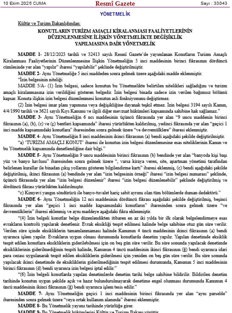 Kültür ve Turizm Bakanlığı, bugünkü Resmî Gazete’de yayımlanan yönetmelik değişikliği ile 28 Aralık 2023 tarihli Konutların Turizm Amaçlı Kiralanması Yönetmeliğini güncelledi.