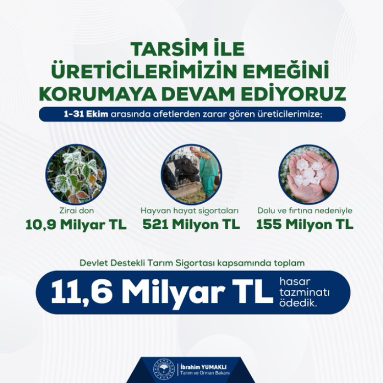 Üreticinin emeğini koruyarak, tarımsal üretimi güvence altına aldıklarına işaret eden Bakan Yumaklı, "1-31 Ekim tarihlerinde Devlet Destekli Tarım Sigortası kapsamında üreticilerimize 11,6 milyar lira hasar tazminatı ödedik. Sürdürülebilir üretim ve gıda arz güvenliğimiz için üreticimizi korumaya devam ediyoruz." ifadelerini kullandı.