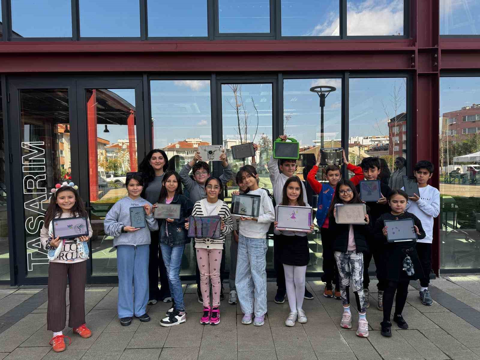 Çocuklar, atölye boyunca Sketchbook programını kullanarak tabletleri ve tablet kalemleriyle keyifli bir dijital sanat deneyimi yaşadı.