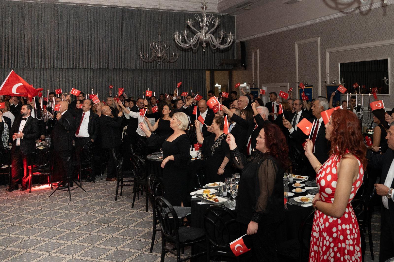 Geceyi onurlandıran Rotary 2440. Bölge Guvernörü Adnan Sözeri, Cumhuriyet Kazanımları Komite Başkanı Serdar Durusüt, Önder Mustafa Kemal Atatürk'ün izinden durmadan yürüyeceklerini söyledi. Konuşmaların ardından sahneye gelen 102. yıl pastası büyük bir coşkuyla kesildi.