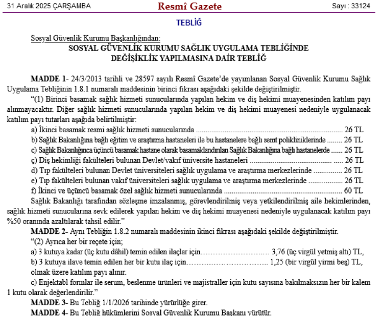 Sosyal Güvenlik Kurumu (SGK) tarafından hazırlanan “Sağlık Uygulama Tebliğinde Değişiklik Yapılmasına Dair Tebliğ”, bugünkü Resmî Gazete’de yayımlandı. Tebliğle birlikte muayene ve reçete katılım paylarına ilişkin yeni düzenlemeler getirildi.