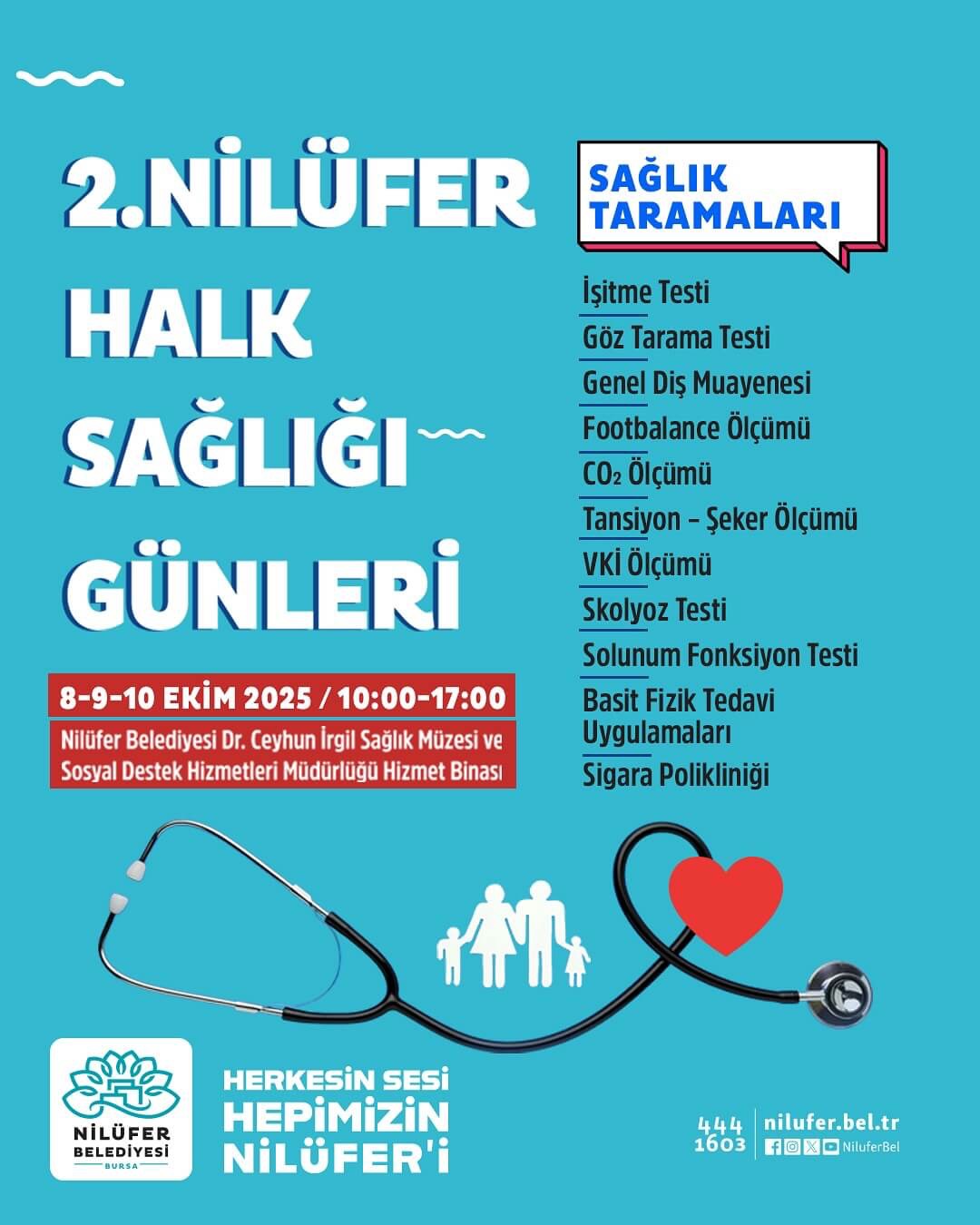 Nilüfer Belediyesi, halk sağlığı bilincini artırmak ve koruyucu sağlık hizmetlerini yaygınlaştırmak amacıyla düzenlediği Halk Sağlığı Günleri’nin ikincisini gerçekleştiriyor. 8-9-10 Ekim tarihlerinde yapılacak etkinlikte, üç gün boyunca ücretsiz sağlık taramaları, farkındalık stantları ve eğitici atölyelerle dolu bir program Nilüferlileri bekliyor.