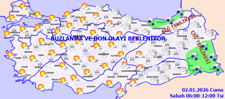 İç ve doğu bölgelerde buzlanma ve don olayı beklenirken, Doğu Karadeniz’in yüksekleri ile Doğu Anadolu’nun doğusundaki eğimli alanlarda çığ tehlikesi bulunuyor.