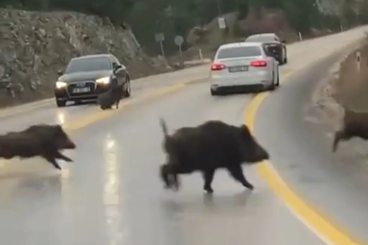 Ormanda yiyecek bulamayan domuz sürüsü Bursa Keles karayoluna inerek yemek aradı. Onlarca domuzu gören sürücüler ise büyük şaşkınlık yaşadı.