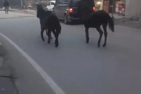 Bursa’nın Osmangazi ilçesi Panayır Mahallesi’nde başıboş atlar ana caddeye çıktı. Dakikalarca sürü halinde ilerleyen atlar bazı sürücülere zor anlar yaşattı. Atların dakikalarca cadde üzerinde ilerlediği görülürken, bir süre sonra gözden kayboldu. O anlar otomobil sürücüsünün cep telefonu kamerasına saniye saniye yansıdı.