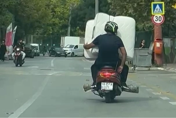 Bursa’nın Yıldırım ilçesinde motosikletli iki kişi aralarına aldıkları yatakla trafiğe çıktı. İnsanlara aldırış etmeden yolculuğuna devam eden sürücü ayaklarının altına aldığı halıyla beraber can sağlığını hiçe sayarak yolculuğa devam etti. Amatör kameraya yansıyan görüntüler bu kadar da olmaz dedirtti.
