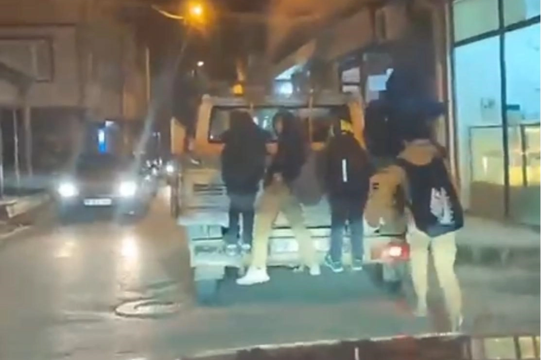 Bursa’nın Osmangazi ilçesi Merinos Mahallesi üzerinde açık kasa bir kamyoneti gören çocuklar, aracın kasasına tutundu.