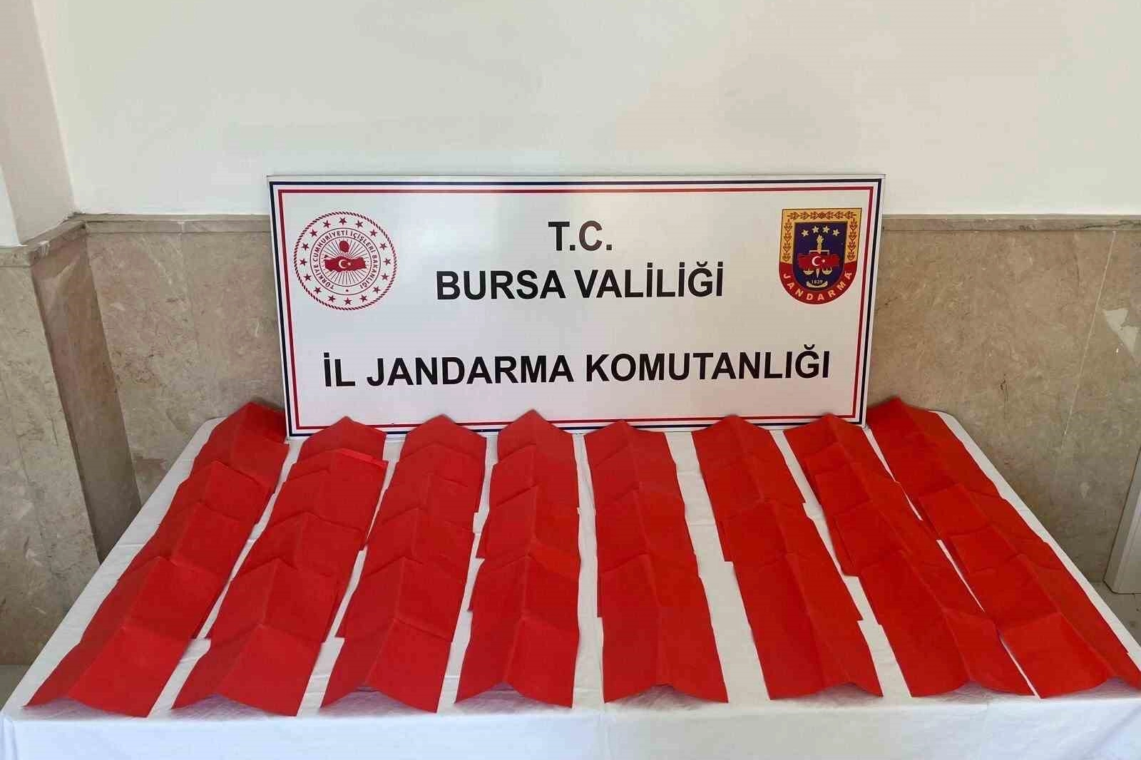 Bursa Cumhuriyet Başsavcılığı koordinesinde, İl Jandarma Komutanlığı’na bağlı Narkotik Şube Müdürlüğü ekipleri tarafından gerçekleştirilen operasyonda durdurulan şüpheli şahsın üst aramasında, paket içerisinde A4 kağıdına emdirilmiş halde 37 parça sentetik kannabinoid bulundu. Ele geçirilen maddenin toplamda yaklaşık 46 bin içimlik olduğu belirlendi.