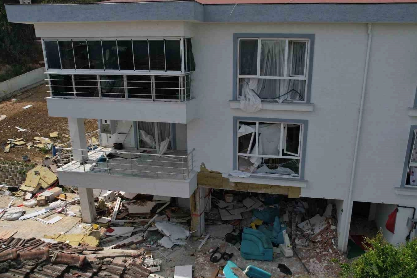 Neredeyse kullanılamaz hale gelen 3 katlı bina ise havadan dron ile görüntülenirken, facianın büyüklüğü gözler önüne serildi.