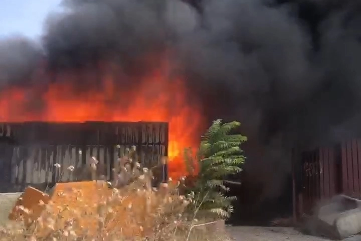 Siyah dumanlar şehrin birçok noktasından görülürken, itfaiye ekipleri yangına müdahale ediyor.