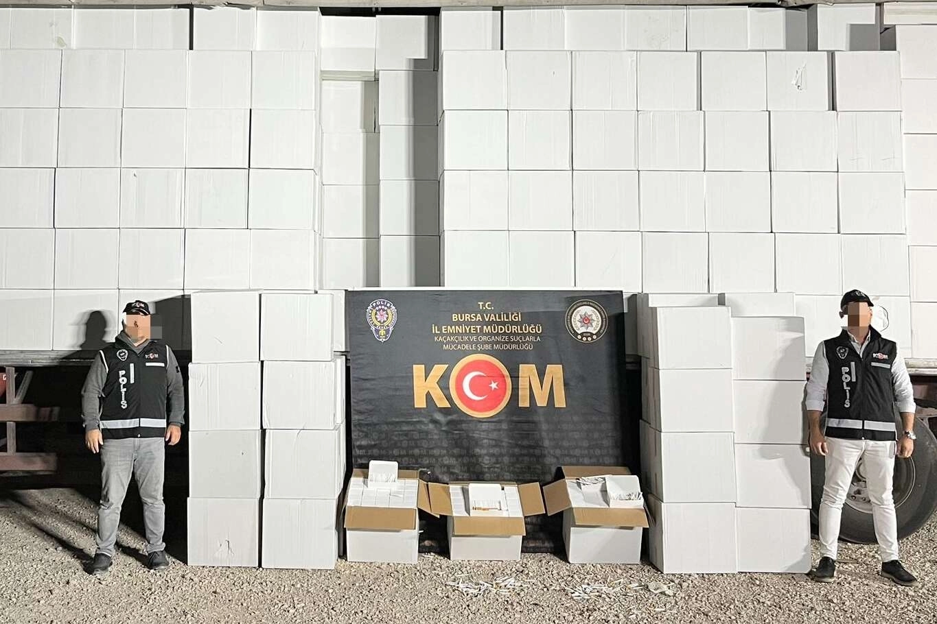 Bursa Emniyet Müdürlüğü Kaçakçılık ve Organize Suçlarla Mücadele Şube Müdürlüğü ekipleri, Cumhuriyet Başsavcılığı'nın talimatıyla Bursa il sınırına giriş yapmak üzereyken Z.P. idaresindeki yabancı ülke plakalı tırı durdurdu. Tırın dorsesinde arama yapan polis ekipleri 15 milyon adet bandrolsüz boş makaron ele geçirdi.