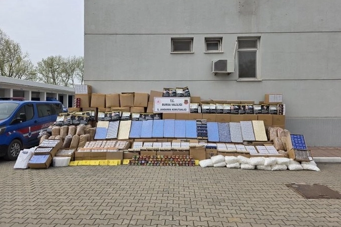 Bursa İl Jandarma Komutanlığı KOM Şube Müdürlüğü ekipleri tarafından kaçakçılıkla mücadele kapsamında yürütülen çalışmalar çerçevesinde, şüphelilere ait iş yeri, depo ve araçlarda arama yapıldı. Yapılan aramalarda 1 milyon 186 bin 600 adet bandrolsüz makaron, 920 kilogram açık sarmalık kıyılmış tütün, 200 bin 800 adet sigara filtresi, 92 bin 620 adet makarona basılmış sigara, 19 bin 800 adet şeffaf naylon sigara poşeti, 18 bin 750 adet boş sigara kutusu, 8 bin 780 paket bandrolsüz sigara, 2 bin 700 paket bandrolsüz sigara kağıdı ile 20 kilogram bandrolsüz nargile tütünü ele geçirildi.