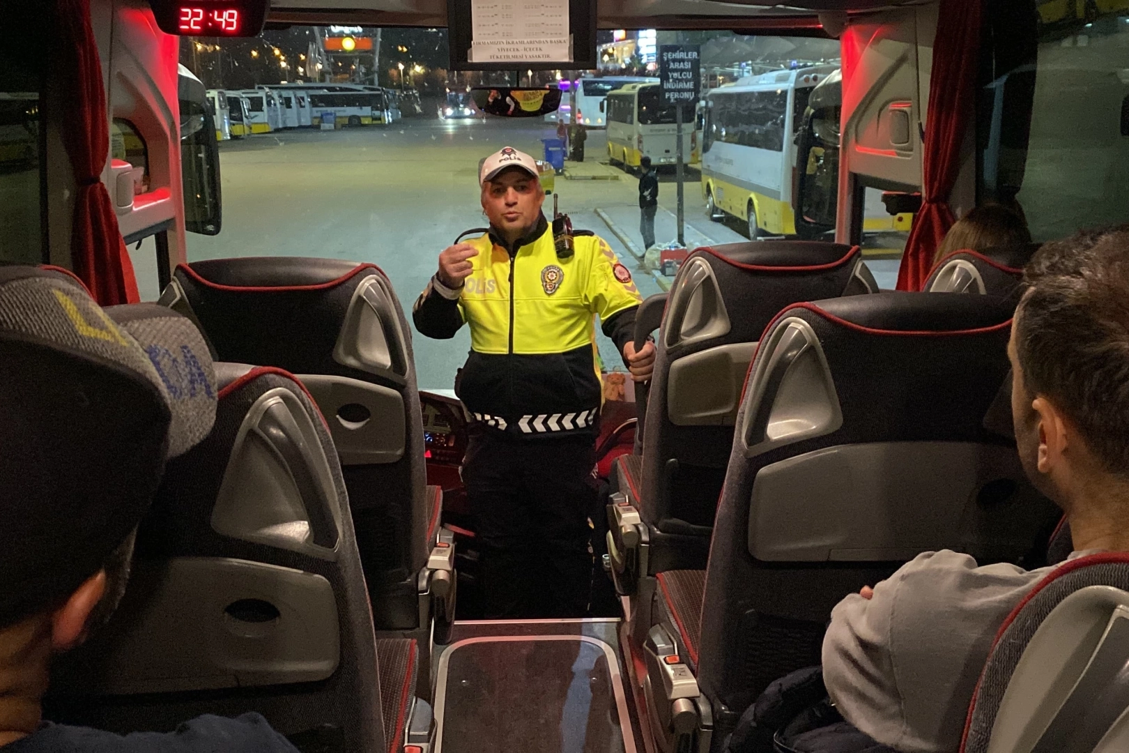 Uygulamada sürücülerin belgeleri kontrol edilirken, yolculara kemer kullanmaları konusunda uyarı yapıldı.