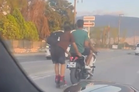 Merkez Osmangazi ilçesi Demirtaş Yolu Caddesi üzerinde seyir halinde olan patenli genç, yorulunca kimliği henüz tespit edilemeyen 16 MC 2790 plakalı motosiklete tutunarak seyahat etti. Kendi canını hiçe sayan paten sürücüsü amatör kameraya yansırken, motosiklet sürücüsünün artçısında da kask olmadığı görüldü.