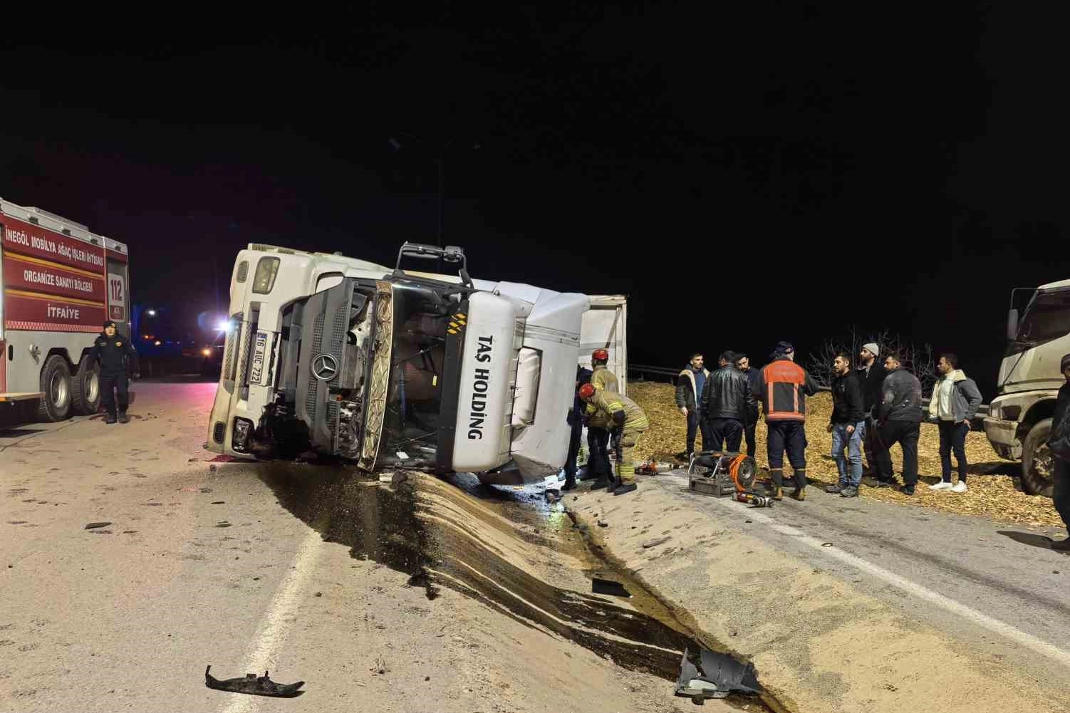 Bursa’nın İnegöl ilçesinde talaş yüklü tır devrildi. Dorsenin altında kalarak sıkışan sürücü kaldırıldığı hastanede hayatını kaybetti.