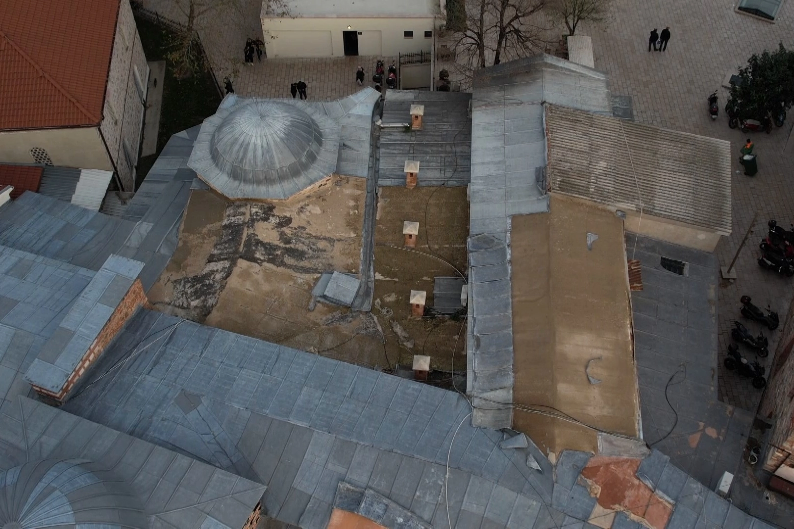 Çatıdan çalınan kurşunlar dron ile de görüntülendi.