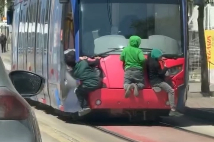 Hareket halindeki tramvayın arkasına tutunan çocuklar metrelerce bu şekilde ilerledi. Çocukların tehlikeli yolculuğunu gören vatandaşlar duruma tepki gösterirken, kimilerine bu görüntüler ’pes’ dedirtti. Herhangi bir olumsuzluk yaşanmadan tramvaydan ayrılan çocuklar gözden kayboldu.