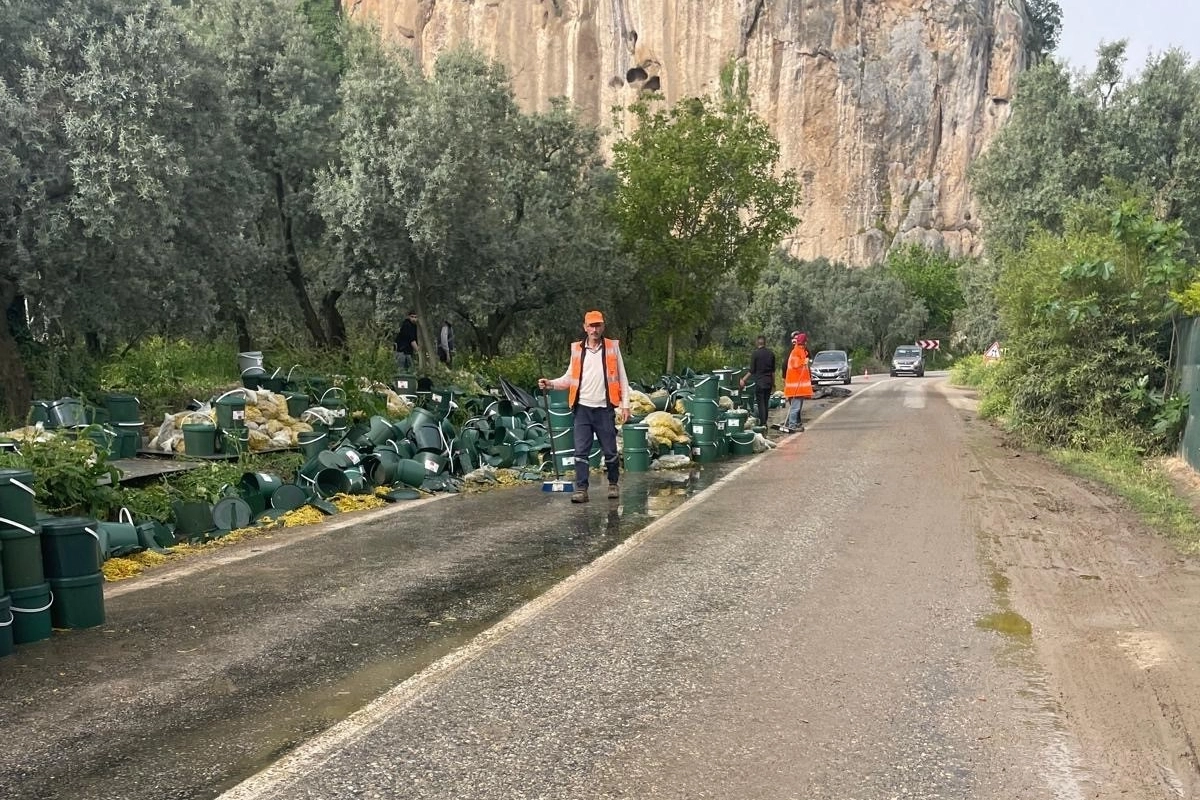 Dorsede bulunan tonlarca turşu yere dökülürken sürücü kazayı yara almadan atlattı. Kaza sonrası yol trafiğe tamamen kapanırken böyleye temizlik ekipleri sevk edildi.