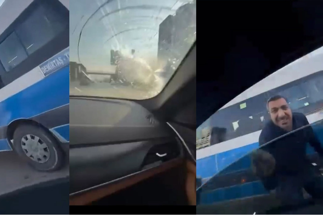 Otomobilde bulunan bir yolcu tarafından cep telefonu kamerasıyla kaydedilen görüntülerde, sürücünün öfkeyle araca saldırdığı anlar yer aldı.