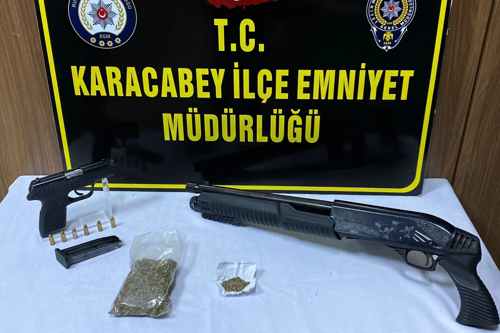 Karacabey İlçe Emniyet Müdürlüğü Asayiş Büro Amirliği ekipleri, ilçede uyuşturucu madde satan ve kullanan şahıslara yönelik operasyon düzenledi. Polis ekipleri şüphe üzerine M.E.T. (33), E.K. (25) ve G.B. (40) isimli şahısların içerisinde bulunduğu aracı durdurdu. Ekipler, durdurdukları araçta şeffaf poşet içerisinde 40 gram sentetik kannabinoid (bonzai) maddesi ele geçirdi. Ayrıca araçta bulunan şüpheli G.B.'nin ikametinde yapılan aramada 50 gram sentetik kannabinoid (bonzai) maddesi, 1 adet siyah tabanca ve 7.65 mm çapında 6 adet fişek, 1 adet pompalı tüfek ele geçirildi.