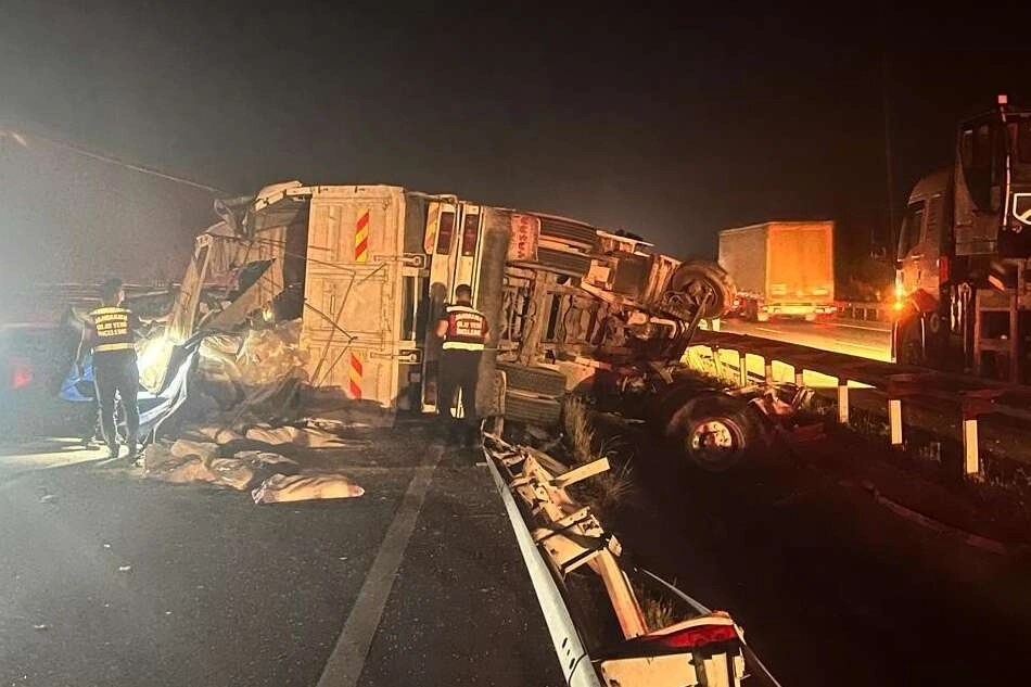 Bursa-İzmir karayolunda meydana gelen kazada 1 kişi öldü, 2 kişi yaralandı. Edinilen bilgiye göre kaza; Bursa-İzmir karayolu TİGEM Karacabey harası yakınlarında, saat 22.30 sıralarında meydana geldi. Hüseyin A.’nın kullandığı 03 L 23034 plakalı tır, İzmir yolunda ilerlerken direksiyon hakimiyeti kaybedilince orta refüjde yan yattı. Tır yan yatmasının ardından sürüklenerek karşı şeridi kapatırken, Bursa istikametine seyir halinde olan Beyhan G.’nin kullandığı 16 T 6024 plakalı taksi tırdan yola saçılan yüke çarptı. Kazanın ardından takside bulunan şoför Beyhan G., Mübeccel K. ve Şükran K. 112 Acil Sağlık ekipleri tarafından yaralı olarak Mustafakemalpaşa Devlet Hastanesi’ne kaldırıldı. Mübeccel K. hastanede yapılan tüm müdahalelere rağmen kurtarılamazken, Şükran K. ve Beyhan G.’nin durumlarının ciddiyetini koruduğu öğrenildi. Beyhan G.'nin tedavisi Bursa Şehir Hastanesi'nde devam ediyor. Bir süreliğine trafiğe kapanan yol, kaza yapan araçların kaldırılmasının ardından tekrar trafiğe açıldı. Kaza ile ilgili soruşturma sürüyor.