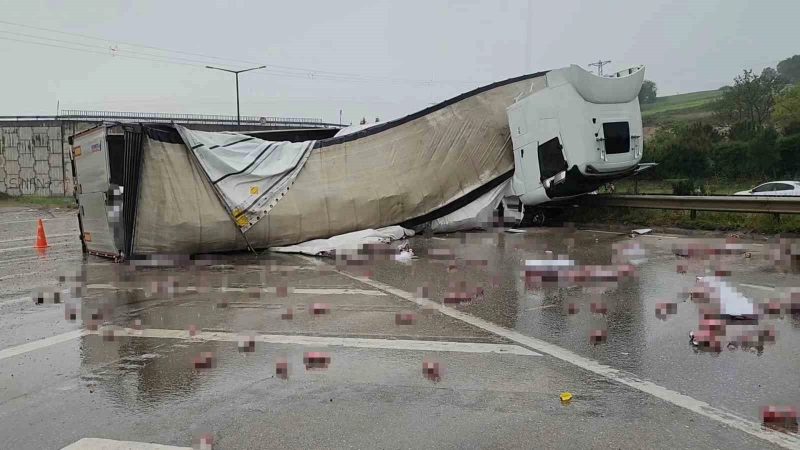 Kaza, saat 07.00 sıralarında Mustafakemalpaşa Terminal Kavşağı’nda meydana geldi. Bursa istikametine seyir halinde olan H.B idaresindeki tır, yağış etkisiyle kayganlaşan yolda sürücünün kontrolünden çıkarak önce bariyere çarptı ardından yola devrildi. Tırın dorsesinde bulunan çok sayıda alkol yola saçıldı. Tır şoförü kazadan yara almadan kurtulurken, trafik kısa süreliğine durma noktasına geldi. Ekiplerin müdahalesiyle yol bir süre sonra tek şeritten kontrollü olarak trafiğe açıldı. Olayla ilgili tahkikat başlatıldı.