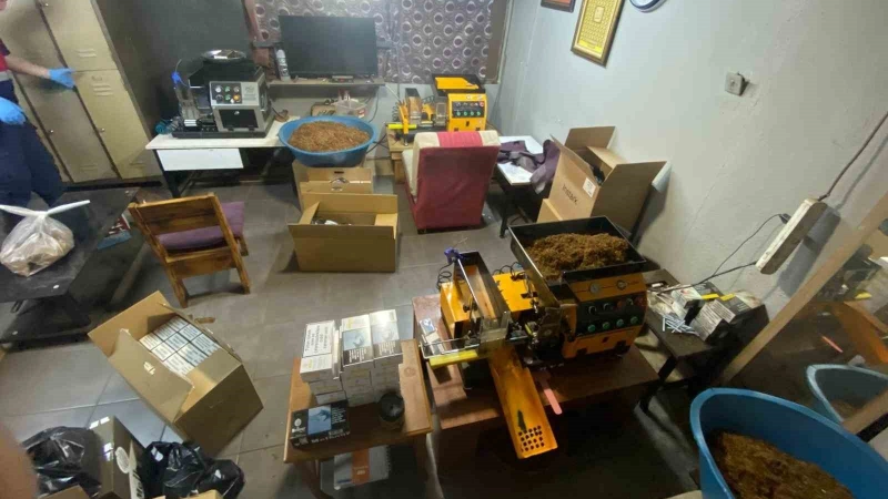 Yapılan operasyonda 80 bin adet tütün basılı sigara, 301 bin 400 adet makaron, 173 kilogram kıyılmış tütün, 47 bin 400 adet boş sigara kutusu, 4 bin 800 adet sigara filtresi, 10 adet elektronik sigara basma makinesi, 4 adet kompresör ve 2 adet hava makinesi ele geçirildi.