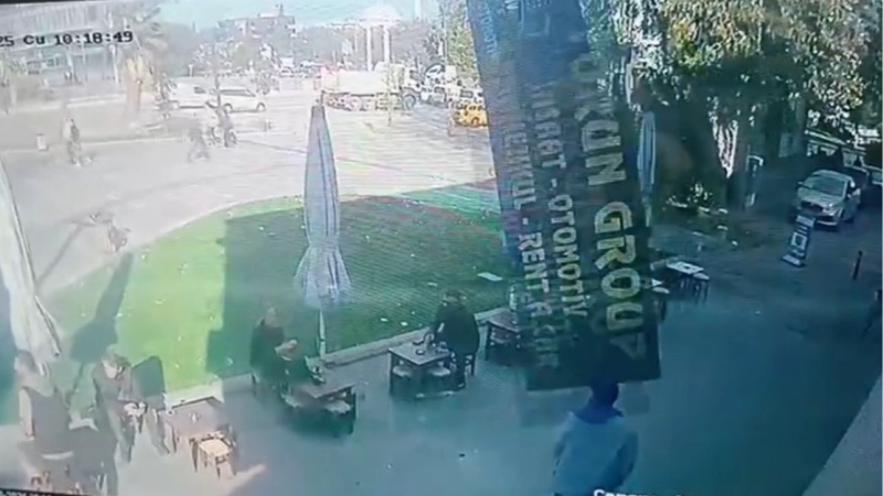 Osmangazi ilçesi Ulu Mahalle’de bulunan bir kafede çay içen iki kişi, lodosun etkisiyle yerinden koparak düşen tabelanın altında kalmaktan saniyelerle kurtuldu. O anlar, iş yerinin güvenlik kamerasına anbean yansıdı.