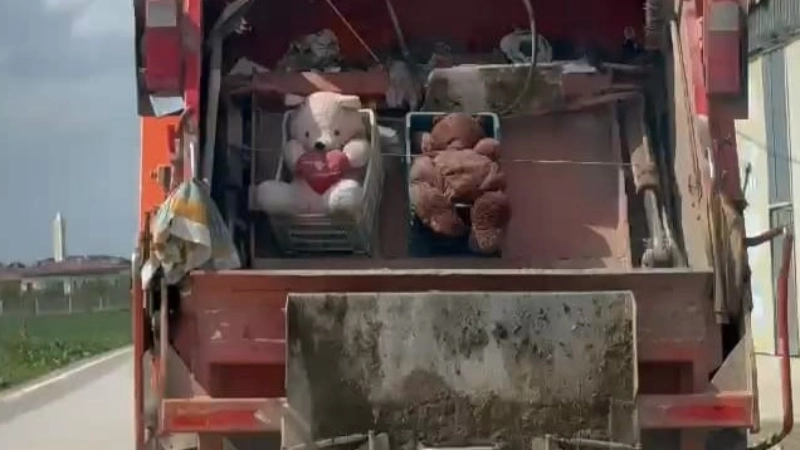 Bayramda da İnegöl ilçesinin temizliğine önem veren temizlik görevlileri, çöp toplamaya devam ediyorlar. Çöp kovalarındaki çöpleri kamyonun arkasına atan görevliler, çöpe atılan iki oyuncak ayıyı kamyonun içine atmaya kıyamayınca ortaya güzel görüntüler çıktı. Görevliler ayıları kamyonun arkasına astılar. O anlar, Ortaköy Mahallesi'nde bir sürücünün amatör kamerasına yansıdı.