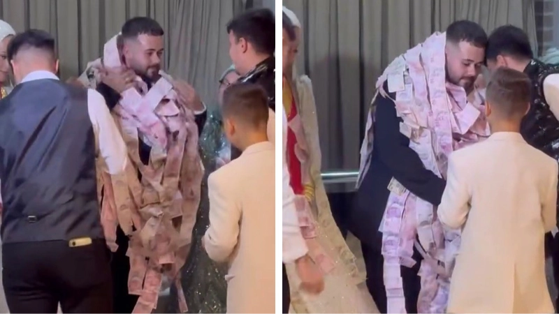 Bursa’da düzenlenen bir düğünde ilginç görüntüler yaşandı. Beyda ve Enes çiftinin mutlu gününde takı merasiminde salona getirilen metrelerce uzayan para şeridi davetlilerin dikkatini çekti. Davetliler arasında şaşkın bakışlar olurken, bazı misafirler telefonlarına sarılarak o anları kayda aldı. 50 metre boyunca uzanan para şeridinin damadın üzerine tek tek dolanması renkli görüntülere sahne oldu.