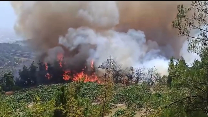 Öğle saatlerinde televizyon vericilerinin bulunduğu Gündoğdu köyündeki çamlık alanda çıkan yangın zeytin bahçelerine ve ekili alanlara da sıçradı. Yangın daha sonra alt taraftaki Çağlayan köyüne doğru büyüdü. Bölgede birkaç noktada yangının sürdüğü öğrenilirken, alevlere hem havadan hem karadan müdahale ediliyor.