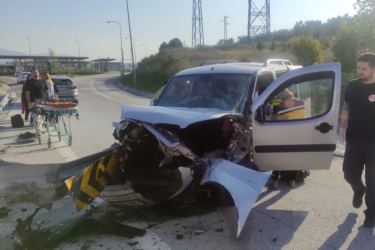 Kazada sürücü Tayfun Y. , eşi Sebahat Y. (54) ile 18 yaşındaki çocukları Ecrin ile ikiz kardeşi Enes Y. yaralandı. Sürücü Tayfun Y. ile oğlu Enes Y. araç içinde sıkıştı. İhbar üzerine olay yerine itfaiye ve sağlık ekipleri sevk edildi. Araç içinde sıkışan baba ve oğul ekiplerin yarım saatlik çalışması sonrasında araçtan çıkarılarak ambulansa taşındı. Yaralılar ambulanslarla Orhangazi Devlet Hastanesine kaldırılarak tedavi altına alındı. Yaralıların hayati tehlikeleri bulunmazken, kaza ile ilgili soruşturma başlatıldı.