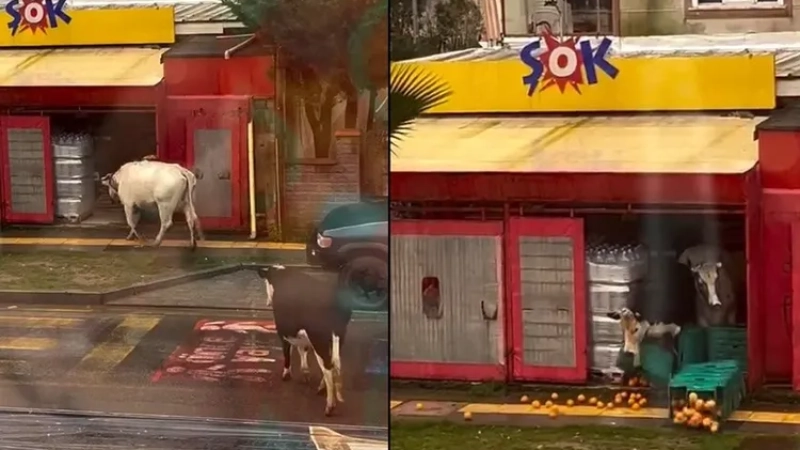Çok sayıda beğeni ve yorum alan görüntülerde, markete giren iki ineğin marulları yediği, bu sırada temizlik yapan bir personelin elindeki paspasla hayvanları uzaklaştırdığı ve girişteki meyve sebze kasalarının devrilme görüntüleri şaşkınlık içinde izlendi.