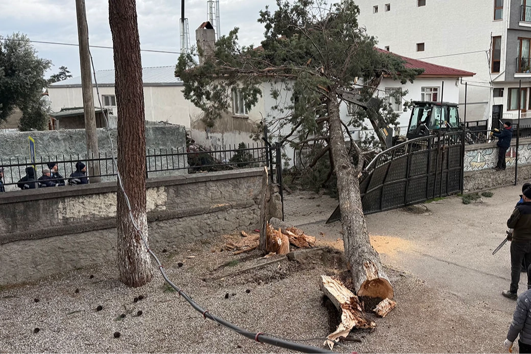 Devrilen çam ağacı nedeniyle Alparslan İlkokulu ve Ortaokulu’nun demir bahçe kapısı ile bahçe duvarlarında da zarar oluştu. Olayın, okulların tatil olması nedeniyle yaşanması muhtemel bir faciayı önlediği belirtildi.